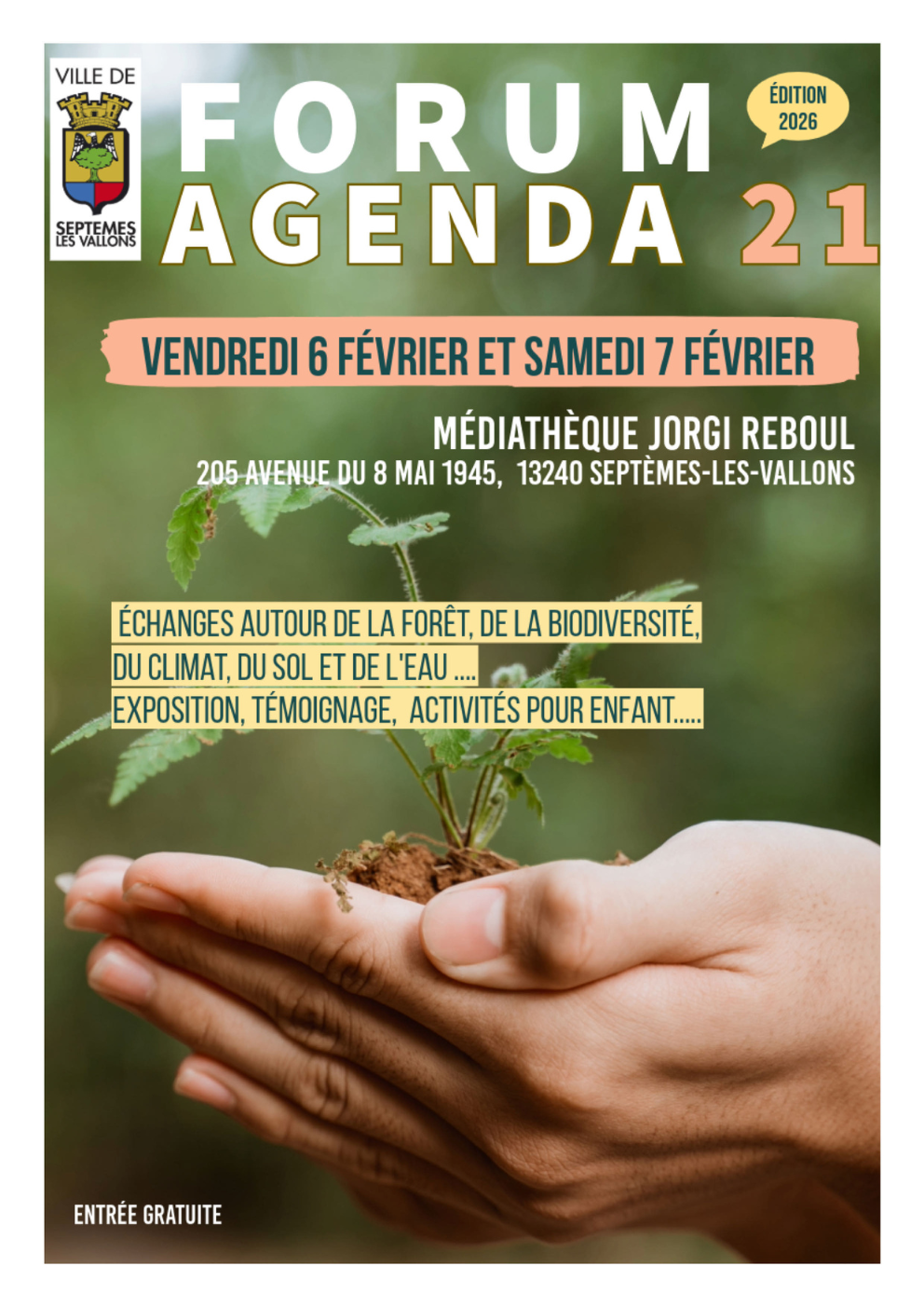 Forum annuel Agenda 21 Forum annuel Agenda 21 Prochaine session Du vendredi 06 février 2026 au samedi 07 février 2026 Ical Condition d'accès gratuit, en accès libre Public Tout public Lieu MEDIATHEQUE JORGI REBOUL Description Le Forum Agenda 21 revient à la médiathèque ! Voir le détail de l'événement