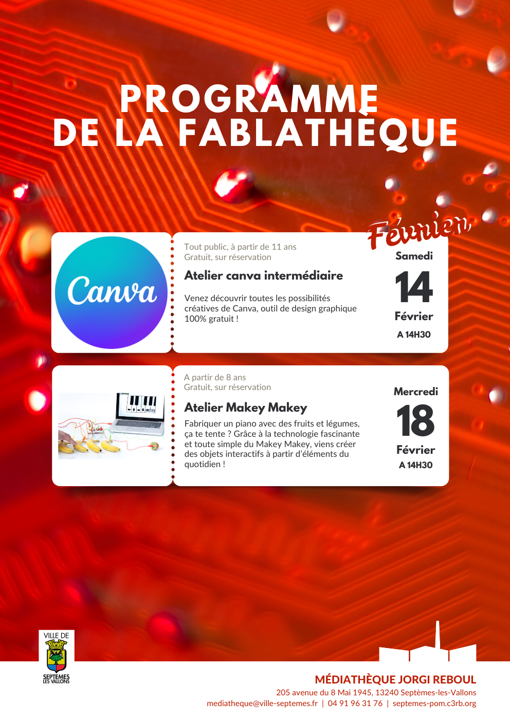 Atelier Makey Makey Atelier Makey Makey Prochaine session Le mercredi 18 février 2026 de 14:30 à 16:00 Ical Condition d'accès gratuit, sur réservation Public Tout public, à partir de 8 ans Lieu MEDIATHEQUE JORGI REBOUL Description Mercredi 18 février à 14h30 Voir le détail de l'événement