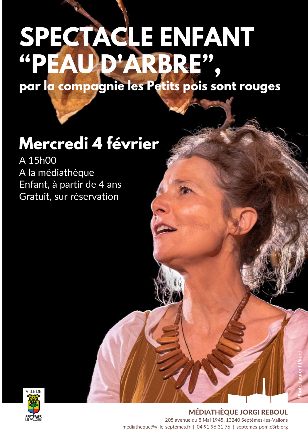 Spectacle enfant “Peau d'arbre”, par la compagnie les Petits pois sont rouges Spectacle enfant “Peau d'arbre”, par la compagnie les Petits pois sont rouges Prochaine session Le mercredi 04 février 2026 de 15:00 à 16:00 Ical Condition d'accès gratuit, sur réservation Public Tout public, à partir de 4 ans Lieu MEDIATHEQUE JORGI REBOUL Description Mercredi 4 février à 15h00 Voir le détail de l'événement