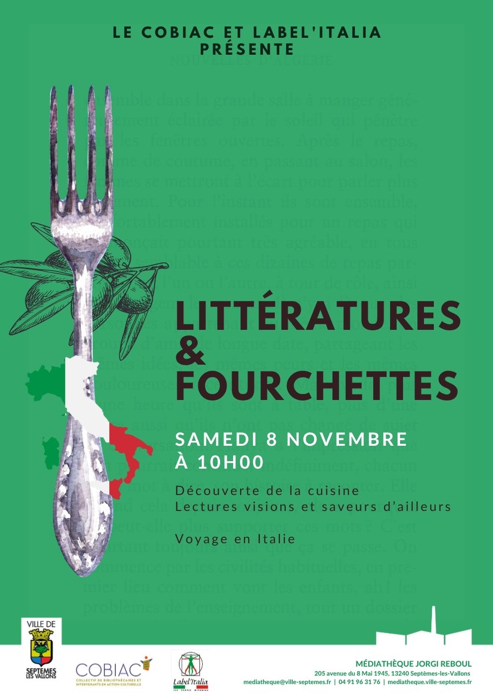 Littératures & fourchettes spécial Italie / Sicile Littératures & fourchettes spécial Italie / Sicile Prochaine session Le samedi 08 novembre 2025 de 10:00 à 15:00 Ical Condition d'accès gratuit, sur inscription Public Tout public Lieu MEDIATHEQUE JORGI REBOUL Description Samedi 8 novembre à partir de 10h00 Voir le détail de l'événement