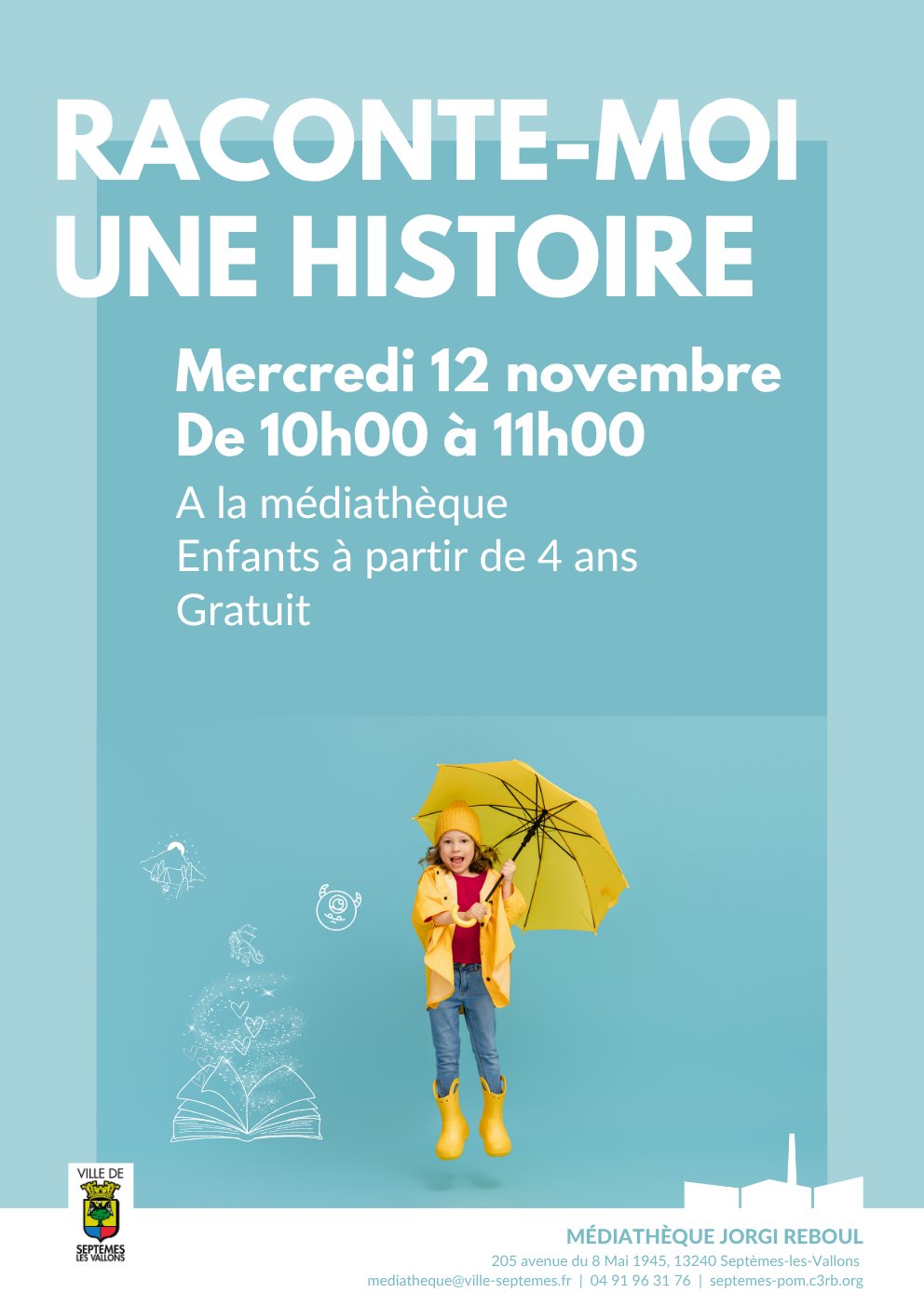 Raconte-moi une histoire Raconte-moi une histoire Prochaine session Le mercredi 12 novembre 2025 de 10:00 à 11:00 Ical Condition d'accès gratuit, sans inscription Public enfants dès 4 ans Lieu MEDIATHEQUE JORGI REBOUL Description Mercredi 12 novembre de 10h00 à 11h00 Voir le détail de l'événement