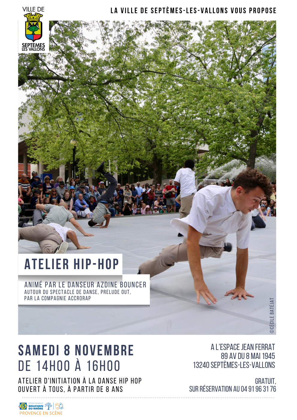 Atelier d’initiation au Hip hop Atelier d’initiation au Hip hop Prochaine session Le samedi 08 novembre 2025 de 14:00 à 16:00 Ical Condition d'accès gratuit, sur inscription Public Tout public, à partir de 8 ans Lieu Espace Jean Ferrat Description Samedi 8 novembre de 14h00 à 16h00 Voir le détail de l'événement