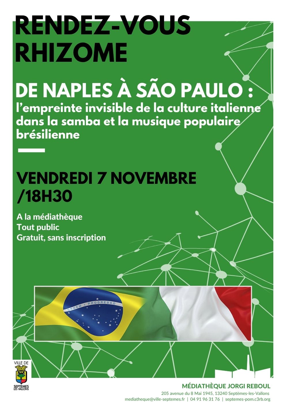 Rendez-vous Rhizome. « De Naples à São Paulo : l’empreinte invisible de la culture italienne dans la samba et la musique populaire brésilienne » Rendez-vous Rhizome. « De Naples à São Paulo : l’empreinte invisible de la culture italienne dans la samba et la musique populaire brésilienne » Prochaine session Le vendredi 07 novembre 2025 de 18:30 à 20:30 Ical Condition d'accès gratuit, sans réservation Public ado et adulte Lieu MEDIATHEQUE JORGI REBOUL Description Vendredi 7 novembre à 18h30 Voir le détail de l'événement