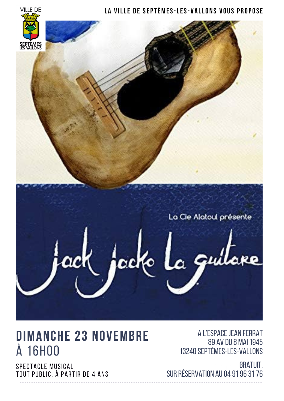 Spectacle musical “Jack Jacko la guitare”, par la compagnie “Alatoul Spectacle musical “Jack Jacko la guitare”, par la compagnie “Alatoul Prochaine session Le dimanche 23 novembre 2025 de 16:00 à 16:50 Ical Condition d'accès gratuit, sur inscription Public Tout public, à partir de 4 ans Lieu Espace Jean Ferrat Description Dimanche 23 novembre à 16h00 Voir le détail de l'événement