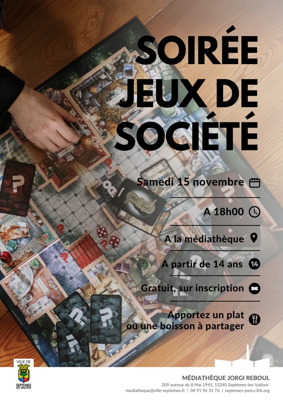 Soirée jeux de société Soirée jeux de société Prochaine session Le samedi 15 novembre 2025 de 18:00 à 21:00 Ical Condition d'accès gratuit, sur réservation Public A partir de 14 ans Lieu MEDIATHEQUE JORGI REBOUL Description Samedi 15 novembre à 18h00 Voir le détail de l'événement