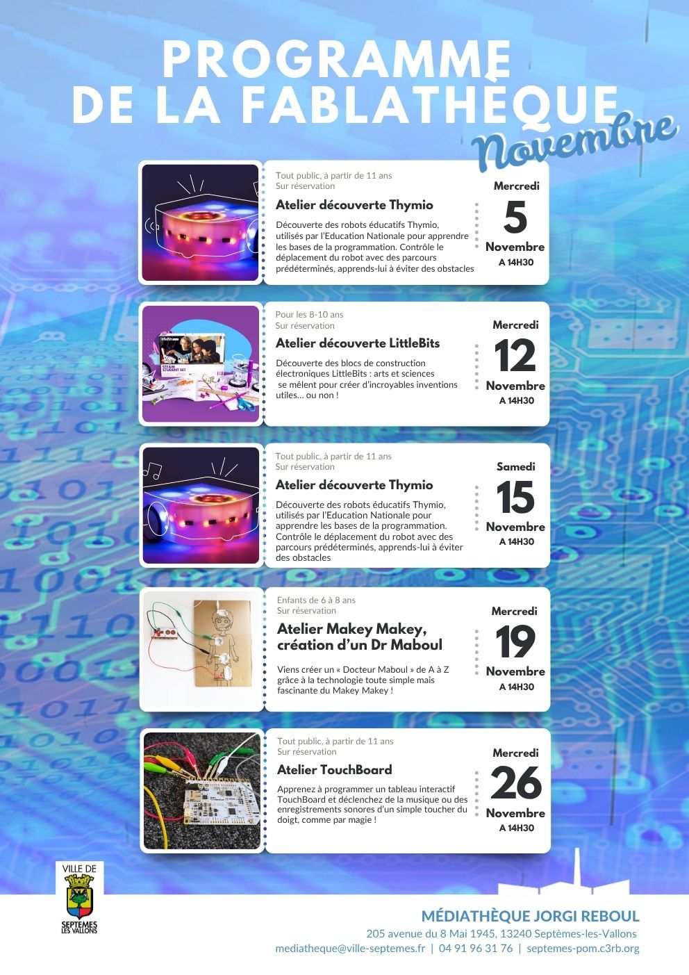 Atelier TouchBoard Atelier TouchBoard Prochaine session Le mercredi 26 novembre 2025 de 14:30 à 16:00 Ical Condition d'accès gratuit, sur inscription Public A partir de 11 ans Lieu MEDIATHEQUE JORGI REBOUL Description Mercredi 26 novembre à 14h30 Voir le détail de l'événement