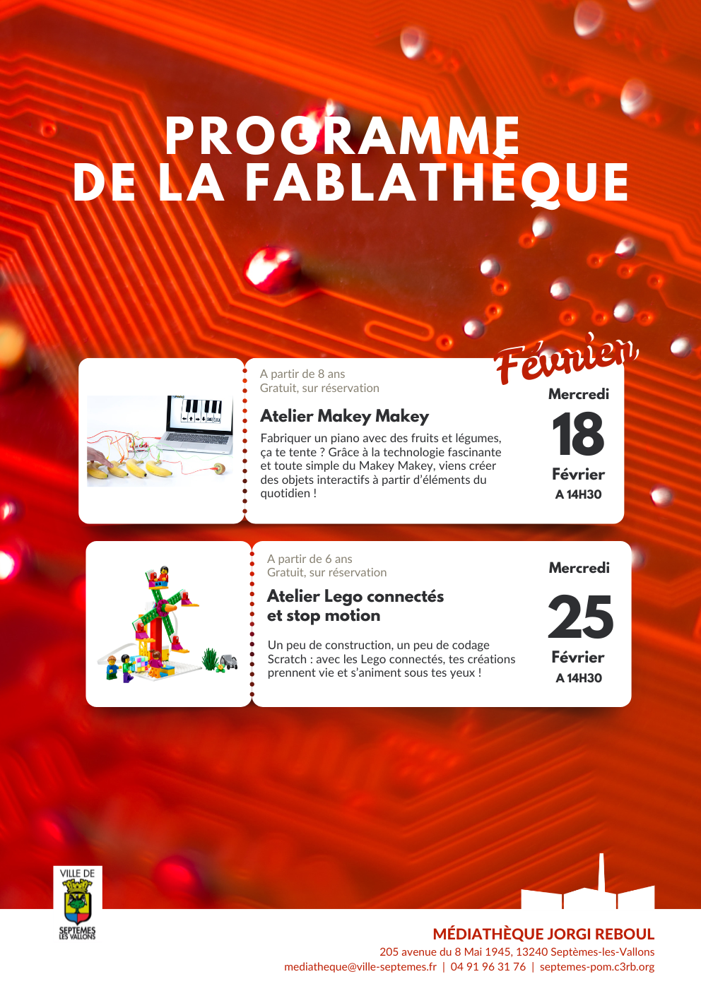Atelier Lego connectés et Stop motion Atelier Lego connectés et Stop motion Prochaine session Le mercredi 25 février 2026 de 14:30 à 16:00 Ical Condition d'accès gratuit, sur réservation Public Enfants à partir de 6 ans Lieu MEDIATHEQUE JORGI REBOUL Description Mercredi 25 février à 14h30 Voir le détail de l'événement