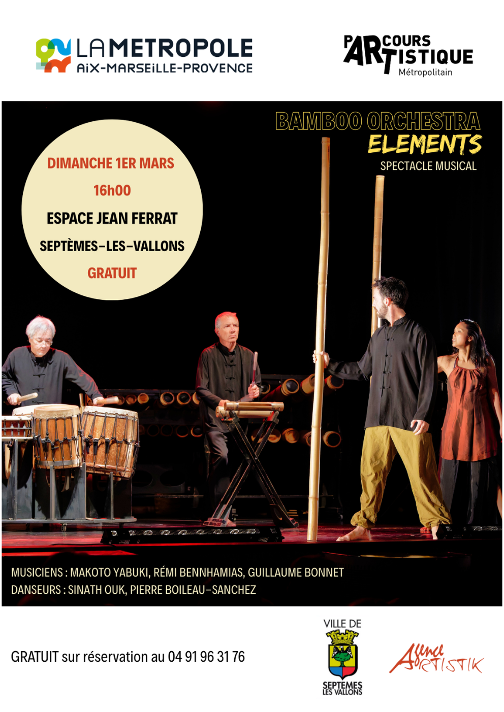 Spectacle musical Bamboo Orchestra, Elements Spectacle musical Bamboo Orchestra, Elements Prochaine session Le dimanche 01 mars 2026 de 16:00 à 17:30 Ical Condition d'accès gratuit, sur inscription Public Tout public Lieu Espace Jean Ferrat Description Dimanche 1er mars à 16h00 Voir le détail de l'événement