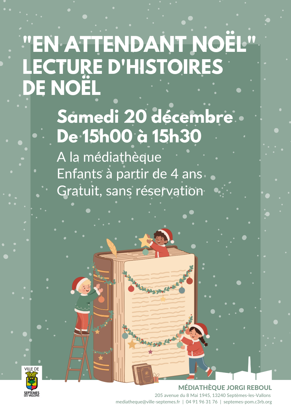 "En attendant Noël". Lectures d'histoires de Noël "En attendant Noël". Lectures d'histoires de Noël Prochaine session Le samedi 20 décembre 2025 de 15:00 à 15:30 Ical Condition d'accès gratuit, sans inscription Public enfants dès 4 ans Description Samedi 20 décembre à 15h00 Voir le détail de l'événement