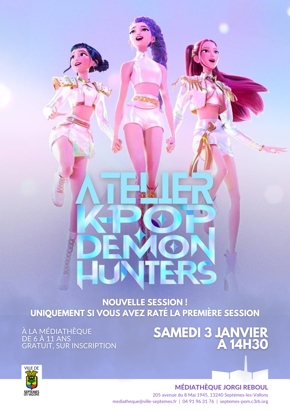 COMPLET ! Atelier K-Pop Demon Hunters COMPLET ! Atelier K-Pop Demon Hunters Prochaine session Le samedi 03 janvier 2026 de 14:30 à 16:00 Ical Condition d'accès gratuit, sur réservation Public De 6 à 11 ans Lieu MEDIATHEQUE JORGI REBOUL Description Samedi 3 janvier à 14h30 Voir le détail de l'événement