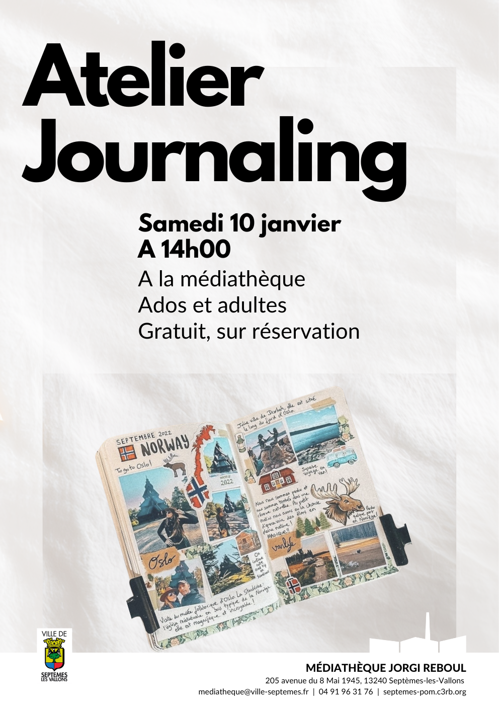 Atelier journaling Atelier journaling Prochaine session Le samedi 10 janvier 2026 de 14:00 à 16:00 Ical Condition d'accès gratuit, sur réservation Public ado et adulte Lieu MEDIATHEQUE JORGI REBOUL Description Samedi 10 janvier à 14h00 Voir le détail de l'événement